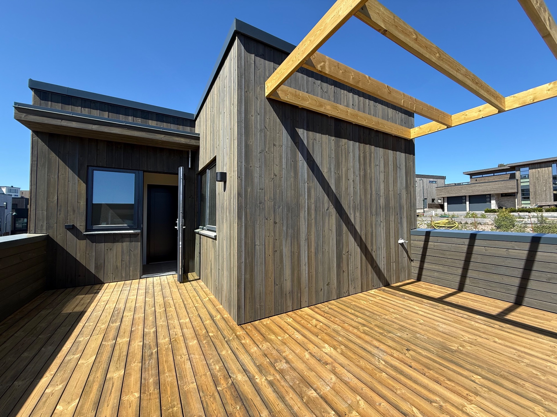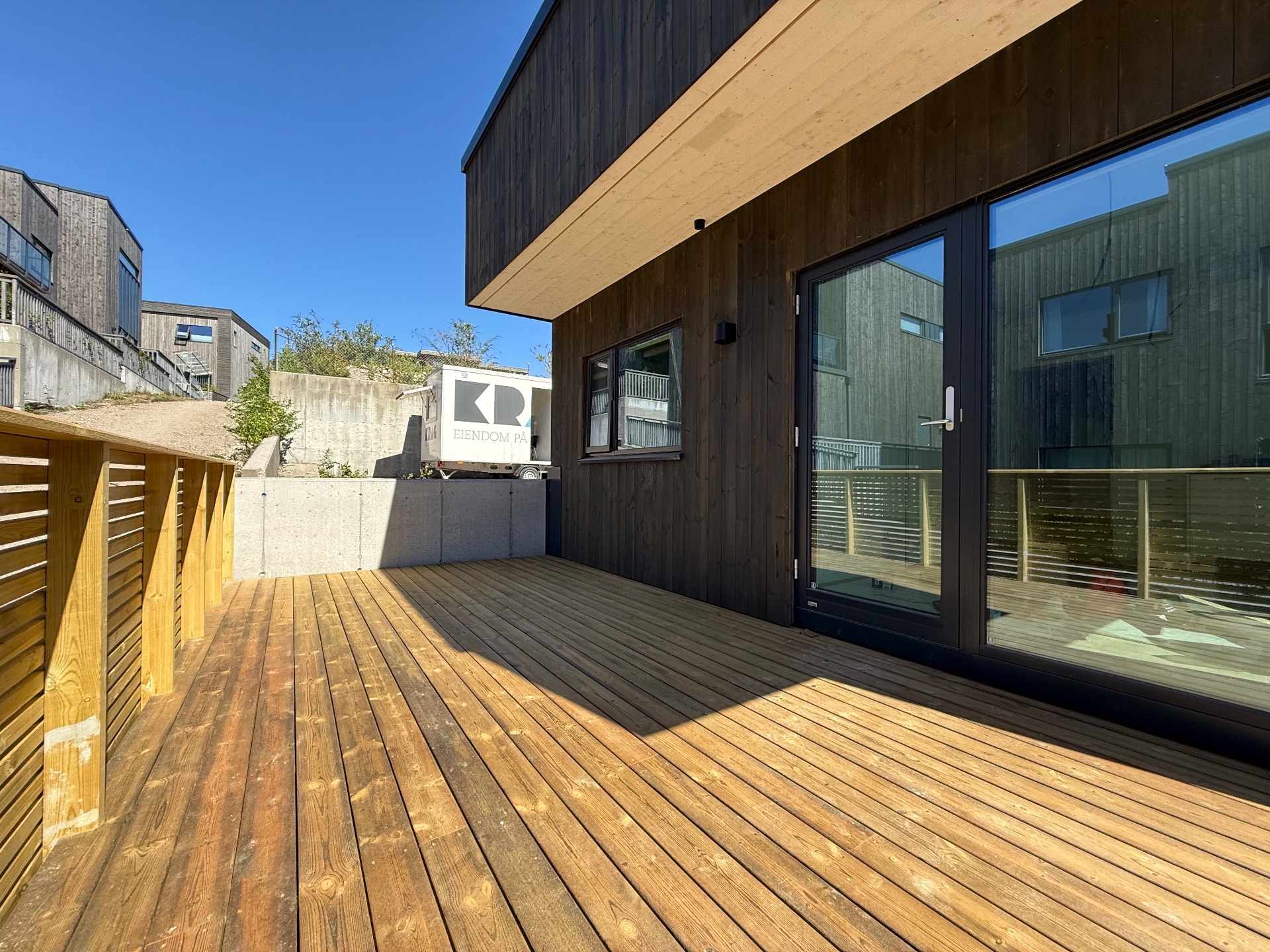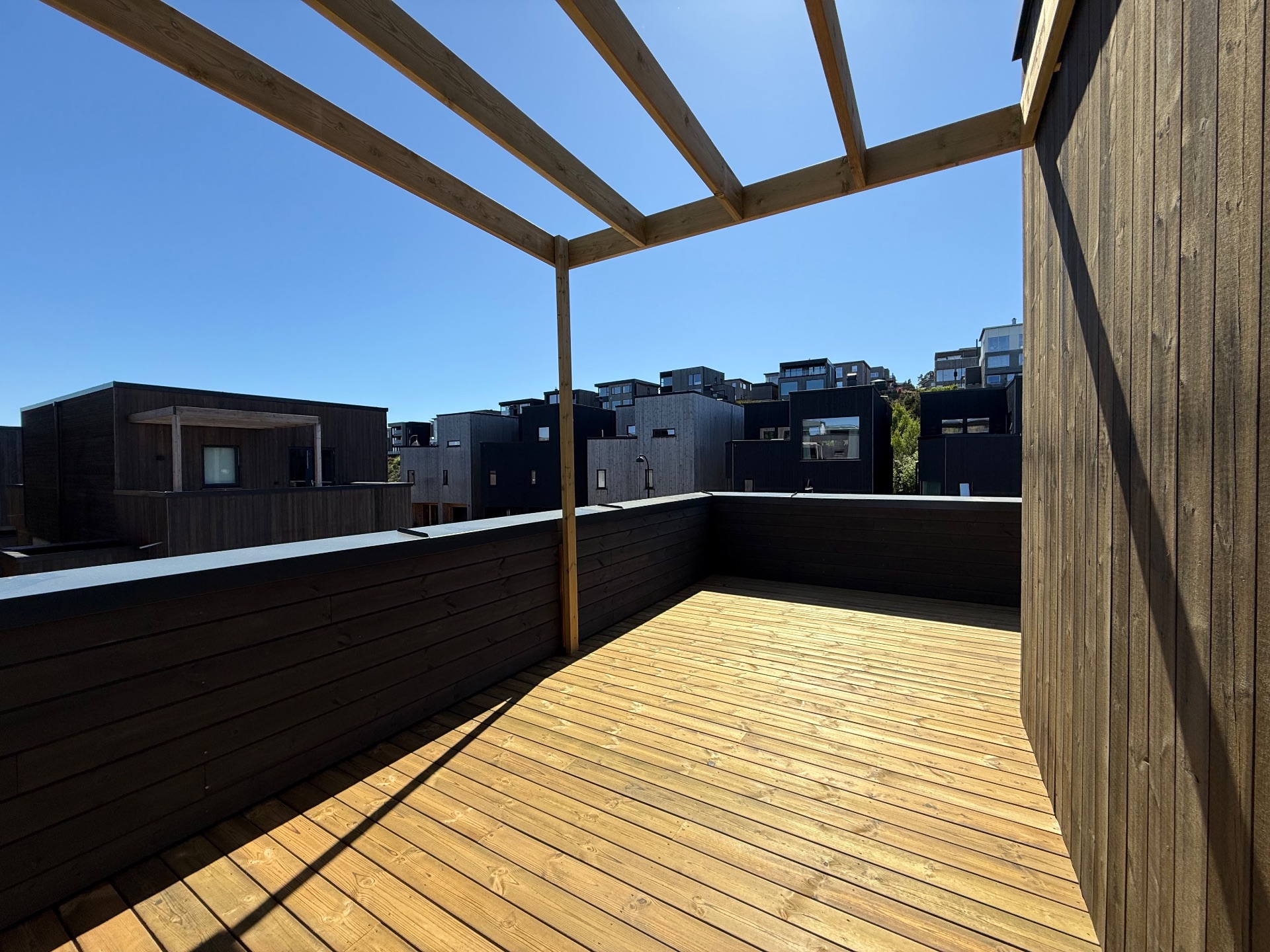 En moderne enebolig med 3 terrasser, hage og utleiemulighet.