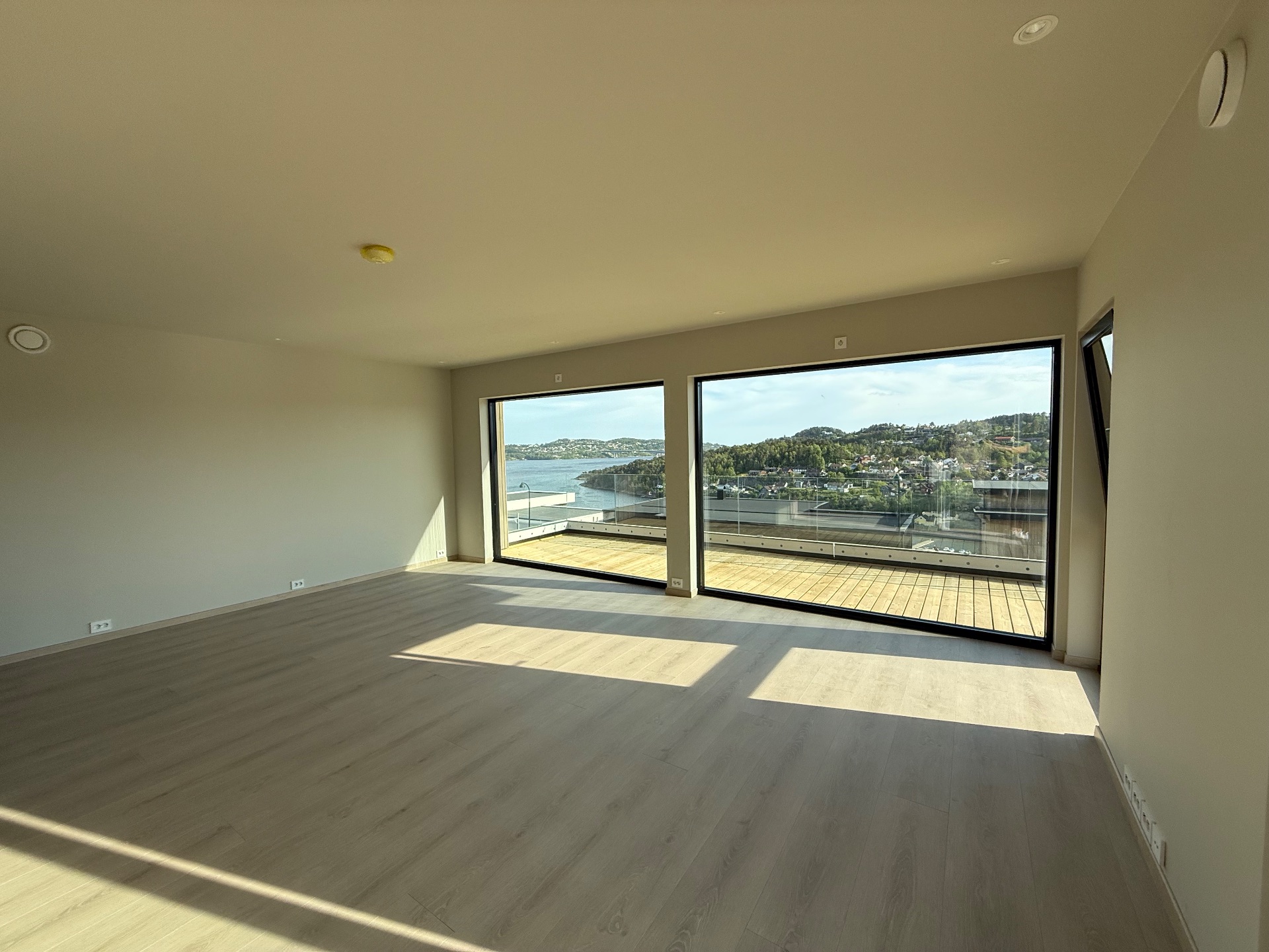 En stor enebolig med helt fantastisk utsikt over Topdalsfjorden og Varoddbroa, stor terrasse med gode solforhold, og utleiedel med to soverom.