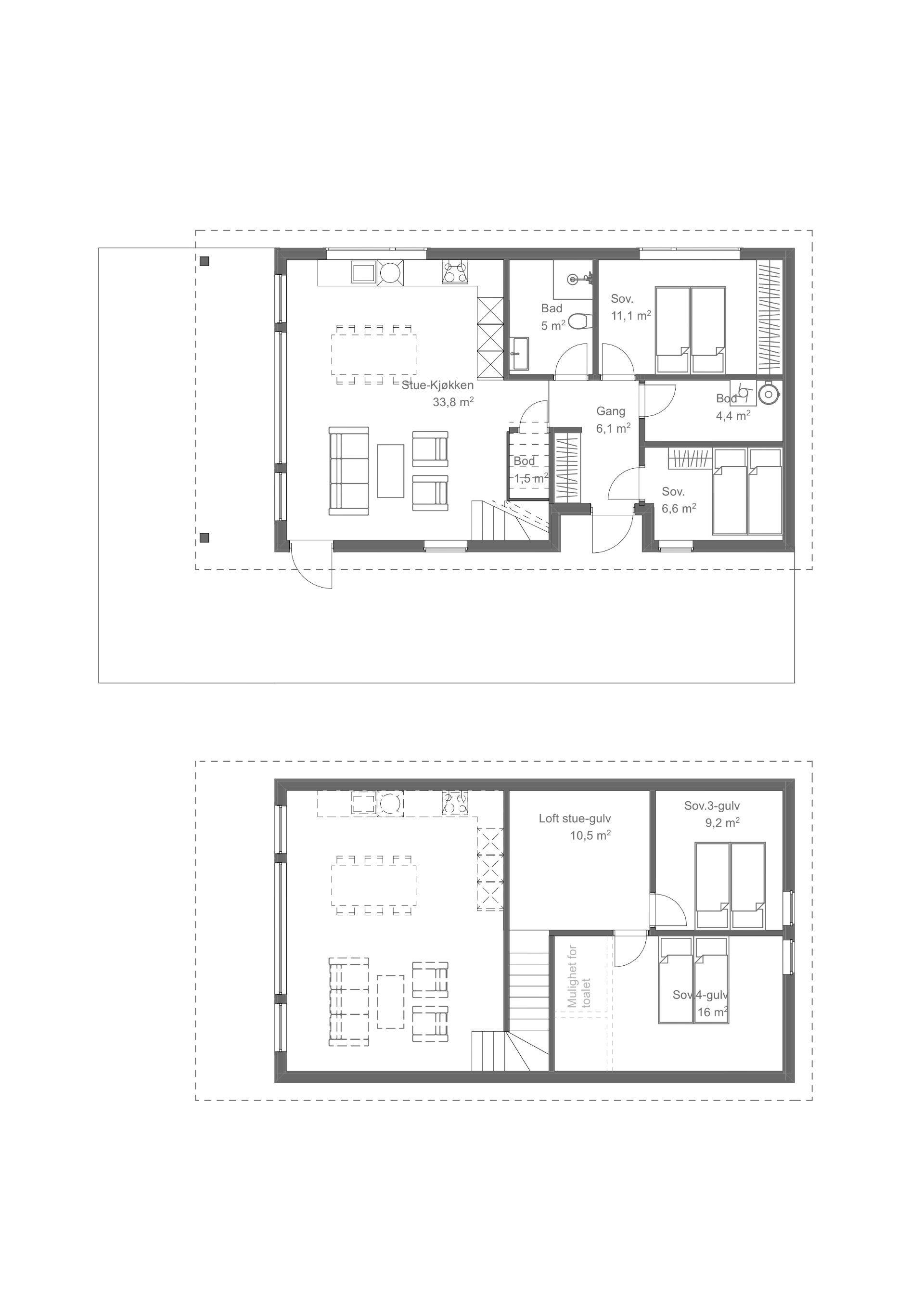 Denne hytten er 126,2 kvm med fire soverom, to bad, stue/kjøkken, loftstue, og terrasse. Garasje og skibod kan også bygges i tillegg.