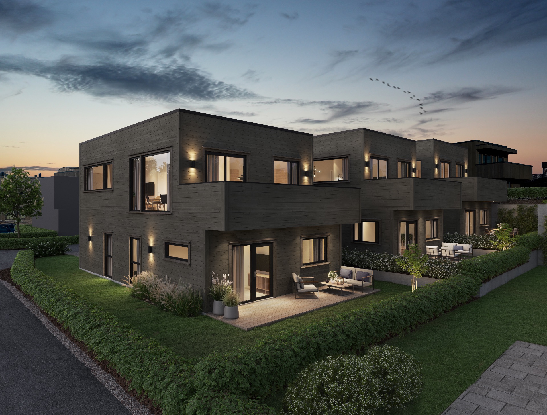 Stue og kjøkken-avdelingen har en terrasse på hver side, samt terrasse på bakkeplan på baksiden av boligen, som gir sol på både morgen og kveld.